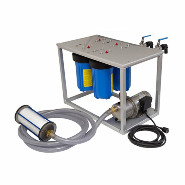 Inlet hose with prefilter, four Eco Rescue filters, detachable tap, outlet hose with tap and a pump needing 230V.
